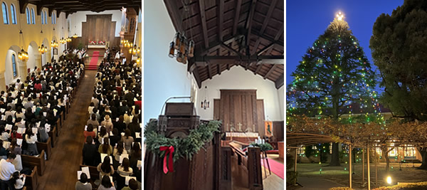 16時開始の礼拝が終わる頃には、中庭のヒマラヤスギもクリスマス・イルミネーションに彩られ、校舎の窓に映る光も幻想的な美しさでした。