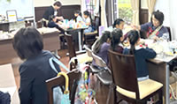 ティールームでは、コーヒー、紅茶、お菓子などを用意し、オリジナルグッズと災害復興支援のための手作り品の販売、クリスマス用装飾小物の制作ワークショップを行いました。